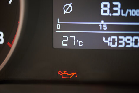 Hvis bilens oljetrykklampe lyser er det fare for umiddelbare motorskader. Kjør inn til nærmeste sikre sted og stans motoren for så å kontrollere oljenivået.Hvis du finner ut at feilen skyldtes for lavt oljenivå kan du kjøre videre etter at du har etterfylt olje. Hvis lampen tennes igjen kan det være at du har lekkasje og må stanse umiddelbart.